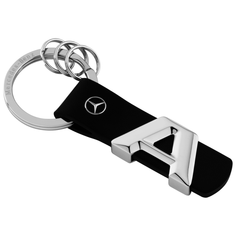 Брелок Mercedes-Benz A-class Keyring Black. Брелоки для ключей «Модельный Ряд». Имитируют буквы на задней части автомобиля. Материал: нержавеющая сталь и кожа. Одно большое и три маленьких кольца для ключей. Звезда «Мерседес-Бенц» на кожаном элементе.
